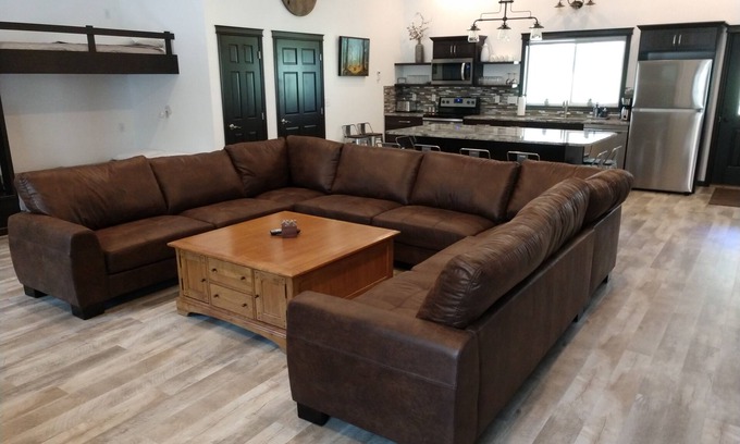Welcome to our new 2018 modern Bunkhouse. The open floor plan has the ability to sleep 10 comfortably with 2 Queen beds and 6 extra long twins. The spacious and contemporary design is a great place for family or friends to come together. Inside you will find an extra large kitchen island that has 10 bar stools. A large U shaped couch is a wonderful place to kick back and watch the 65" flat screen tv or enjoy the cozy propane fireplace just beneath. We also have a heating/cooling unit that efficiently keeps the bunkhouse at your desired temperature. Walking out onto the covered front porch you'll find the most stunning view on the property! On the porch there is a table and chairs to relax and on those lucky nights watch a large herd of elk come into the field.