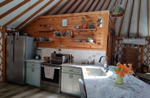 The yurt has a warm and inviting atmosphere. With an open living space, fully equipped kitchen, high domed ceiling and full bathroom you will have all the amenities of a traditional house. The large deck has outdoor seating and a gas fire pit which is perfect for the cool summer nights!