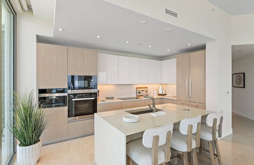 Residents enjoy resort-style amenities including valet parking, full beach and pool service, two state-of-the-art gyms, a yoga terrace, on-site restaurants, and access to a world-class, 100,000-square-foot spa. This home seamlessly blends unmatched comfort with contemporary coastal elegance.