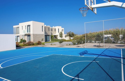A stunning 100 sqm infinity pool, a basketball court, a charming gazebo by the pool and sea, perfect for dining and sunset views.