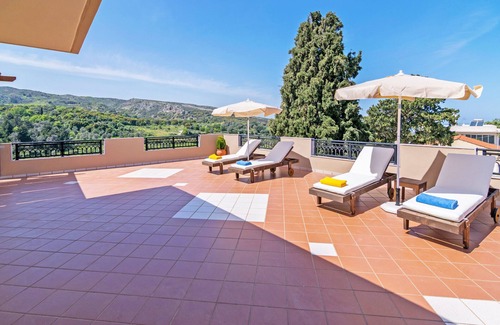 Moving to the second floor, you'll discover two more bedrooms, one with a single bed and another with twin beds, along with a shared shower/WC. On this level, a spacious, partially covered wooden pergola terrace offers breathtaking views of the Cretan countryside. You'll find plenty of sunbeds for sunbathing, relaxing, and reading while enjoying the Cretan sun and cooling off with the mountain breeze.