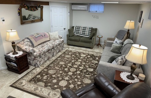 We have a 1100 square foot air-conditioned basement apartment, with a private ground level entrance. A large lawn and swing set for the children to enjoy.