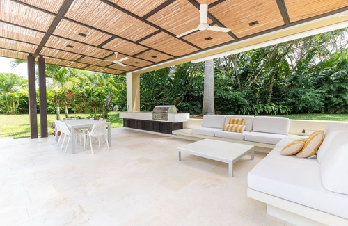 Outside the villa is the deck with comfortable sofas, sun loungers covered with umbrellas and the large infinity pool with a jacuzzi. For alfresco dining, the villa has a gas grill and dining table.
