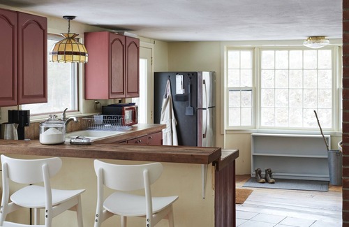 Upon entry to the home guests are greeted with the cottage's antique charm. The rustic kitchen offers everything a guest may need to enjoy their best home cooked meal. Kitchen is stocked with appliances and there is a set of plates, bowls & flatware for 8. The quaint breakfast nook & dining table for 8 are punctuated by stunning natural light from a bay window.