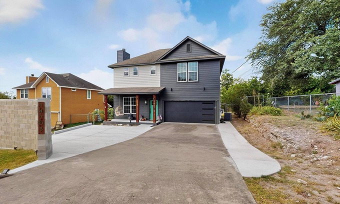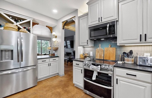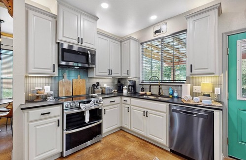 Beautifully updated and remodeled! This three-bedroom, 2 1/2 bath, two-story home. All bedrooms are up. Super stylish, pet-friendly "Apache's Den" has a large living room, a beautifully updated kitchen, new appliances, paint, flooring, hardware, and light fixtures. A luxury primary bath with Emerald Green Tile. A terrific home away from home. High-speed Internet, a covered patio, 2 garage access, washer/ dryer, and a Coffee pot. Smart TVs in all Bedrooms. Perfect for more extended stays or short staycations.