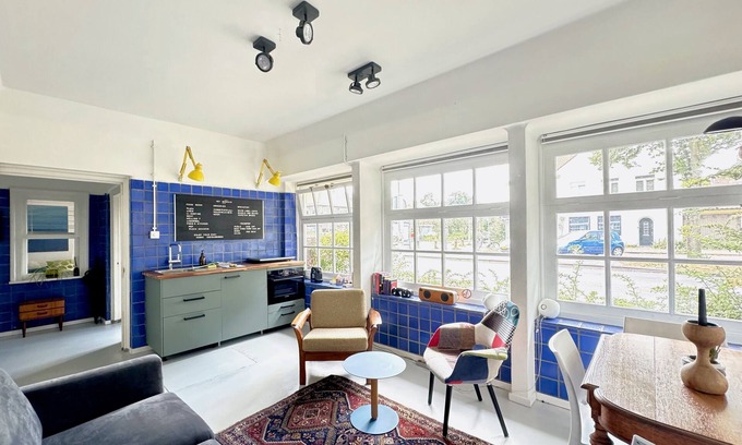 You are staying in a monumental building. Before it was a Bathhouse where the people from the neighborhood used to shower when they had no showers at home. It closed as a bathhouse in 1985. One Room is a former machine room of the Bathhouse with high ceiling of 5 meter. The other is a former ticket booth. You can still see the ticket booth and the old blue tiles of the Bathhouse.