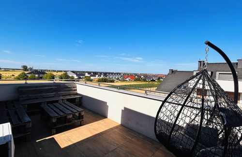 The apartment is finished to the highest standard, featuring high-quality furnishings and premium kitchen and household appliances. It is fully equipped and consists of a living room with a kitchen, a bathroom, and a 20 m² terrace with lounge furniture and a cozy cocoon chair—offering plenty of space for a comfortable stay.