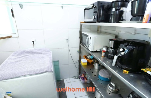 A cozinha é completa e funcional, com fogão, forno, geladeira, freezer, micro-ondas, cafeteiras (comum e elétrica), airfryer, sanduicheira, torradeira, liquidificador, armários, taças de vinho, filtro de água gelada e utensílios essenciais para o dia a dia.