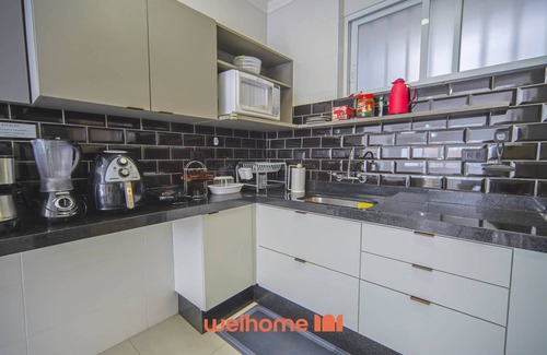 Cozinha: completa com fogão, geladeira, micro-ondas, airfryer, liquidificador, sanduicheira, cafeteira tradicional, filtro de água gelada, armário, louça, talheres, copos, panelas, assadeiras, utensílios básicos e bancada com banquetas.