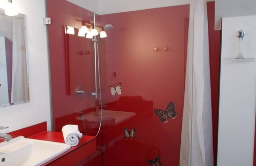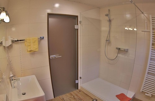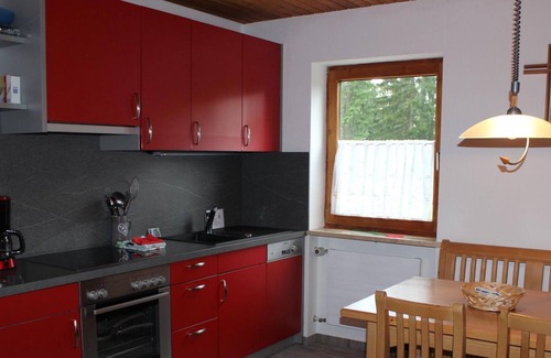 2-room apartment in a modern country house style. Separate bedroom with double box spring beds and a large window with mountain views. In the living room is a new, fold-out, bed-high double sofa bed, a large window, dining area with bench and chairs and flat screen with satellite TV. The new bathroom has a walk in shower, toilet, hair dryer and window. Direct exit to the covered seating area and a large sun terrace. Here you can enjoy absolute peace.