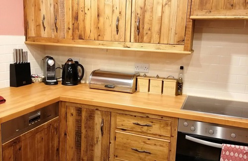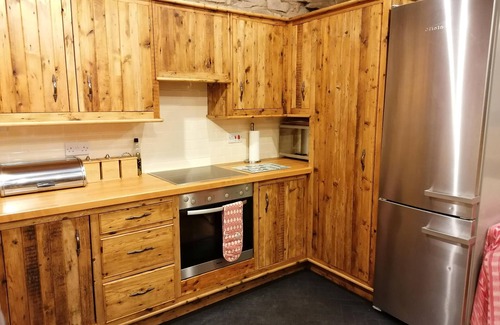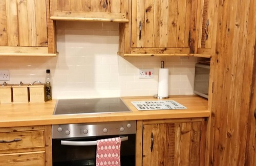1 bedroom apartment. Sleep 3. This apartment is open plan over two levels, with the bedroom and bathroom being on the lower level, accessible down 3 small steps. There is a rustic feel to this apartment and it has mainly been furnished with items made from reclaimed timber which is in keeping with the nature of the property. The large open plan kitchen area has recently been refurbished, facilities include a full sized electric cooker, dishwasher, microwave, Nespresso Coffee Machine and small fridge/freezer. There is a dining area with a table which will easily seat up to 4 people. Comfortable seating in the lounge area with a colour TV and DVD player. The wood burning stove is the main feature of this area and gives a cosy feel to the apartment at the end of the day.