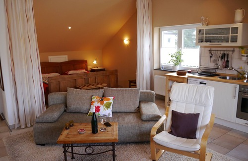 The large 1 room apartment has a fully equipped kitchenette, a dining area, a pull-out sofa and an optically separated sleeping area with a double bed and a bathroom with shower / toilet.