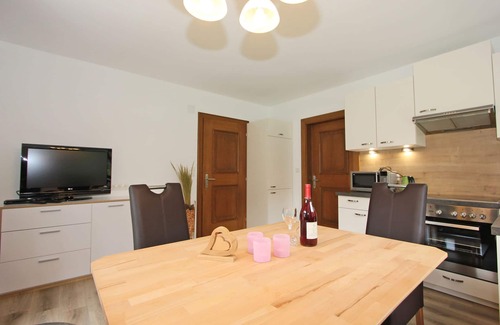 The ground floor features a new, neatly furnished apartment with a spacious kitchen diner, two bedrooms with double beds/one with an additional bunk bed, a bathroom, a guest WC and a beautiful garden terrace for relaxing during the summer months. Parking and ski storage facilities are available on the premises too.