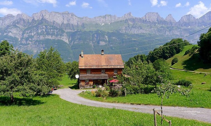 Oberterzen: Enjoy a holiday comfortable surrounded by rabbits, chickens, cats and dogs. Child friendly working farm "Gubser", 630 m a.s.l surrounded by meadows. On the outskirts, in a secluded, quiet, sunny position on a slope, 3 km from the lake, 300 m from the skiing area, in the countryside. For shared use: garden. Patio, terrace. In the house: lounge, table tennis, playroom, table football, sun terrace, storage room for skis, central heating system. Motor access to the house. In Winter: please take snow chains. Stepped path (15 steps) to the house. Parking at the house. Grocery, restaurant 200 m, bus stop 200 m, railway station "Unterterzen" 3 km, outdoor swimming pool 3 km, bathing lake "Walensee" 3 km. Mountain railway, skisport facilities, ski school 300 m. Well-known ski regions can easily be reached: Flumserberg 300 m. Well-known lakes can easily be reached: Walensee 3 km. Hiking paths: Flumserberg. Please note: In case of good snow conditions, the house is accessible on skis. The owner lives on the same property. Animals in the neighbourhood.