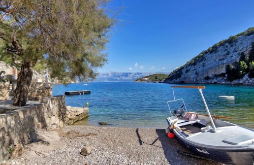 Apartment house "Cico". 6 km from the centre of Gdinj, in a quiet, sunny position, 10 m from the sea, 10 m from the beach. For shared use: property 200 m2 (fenced). Terrace (20 m2), garden furniture, barbecue. In the house: internet access, bicycle rental. Parking at the house on the premises. Shop 6 km, restaurant 40 m, bus stop 50.7 km, rocky beach, concrete beach 10 m. Please note: private mooring, on request. Motor-boat rental possible (on request, extra).