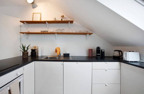 Located in Lörrach, this freshly renovated 51 sqm apartment on the 3rd floor accommodates up to 4 guests with 1 bedroom featuring a box spring bed, dresser, and desk, plus a living room with 2 sofa beds where children can sleep comfortably. You will find a private modern well-equipped kitchen with stove, oven, refrigerator with freezer compartment, cookware, dishes, and coffee machine. The apartment features air conditioning, private Wi-Fi suitable for video calls, a 65 inch flat-screen smart TV with video on demand, and a dedicated workspace. A modern bathroom completes your stay.