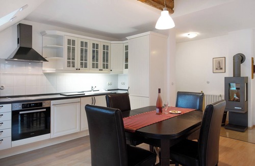 Kitchen, dining and living room with panoramic stove, bedroom, daylight bathroom with bathtub, shower, bidet, WC, separate guest toilet, stairs to the open gallery with double bed or 2 single beds, private outdoor seating area with garden furniture and barbecue facilities, cozy living under beautiful exposed wooden beams and with panoramic and water views. Private sauna in the coach house.