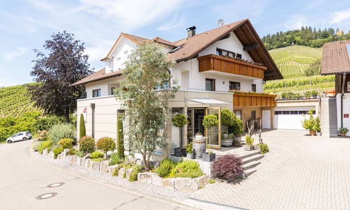 The apartment has been completely renovated, modernized and furnished with great attention to detail. Tradition and modernity harmonize well with each other. Lots of sunlight and an open kitchen create a cozy ambience and a feel-good atmosphere. The facilities include: A two-person apartment with an area of 50 square meters and space to feel at home, a cosy living/dining room with a new kitchen, a bedroom (can be darkened) for dreaming, a bathroom with shower and WC for daily refreshment, accommodation for non-smokers, a covered south-facing balcony for sunny hours, a parking space directly at the house, a covered outdoor seating area with a wonderful view of the vineyards and a sun lounger in the garden. You can charge your electric vehicle at the hotel's own charging station during your stay (additional costs may apply). We also offer you the opportunity to experience the various work on the farm "up close" throughout the year. Farm treats - homemade and regional delicacies from our farm store. With the Konus Black Forest Guest Card, you can enjoy many benefits in our region. Among other things, you can use all buses and trains of the participating transport associations free of charge during your stay.