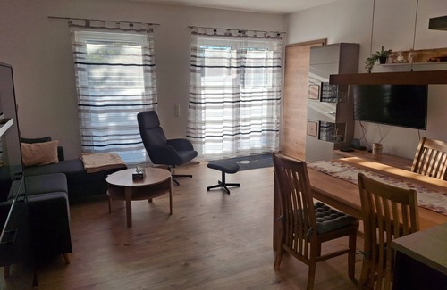 Located in Abenberg, this modern 70 sqm apartment welcomes up to 4 guests with 2 bedrooms and 1 bathroom. One bedroom features a comfortable box spring bed, while the living room includes an additional sofa bed ideal for guests. You will find a private fully-equipped kitchen, Wi-Fi suitable for video calls, a 55-inch smart TV, washer, and dryer. The apartment offers step-free access and step-free interior with extra-large doors, making it wheelchair accessible. Entertainment options include board games, magazines, books, and self check-in for your convenience.