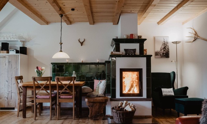 By the fire of the Black Forest tiled stove with a view of the cuckoo clock, the rustic beams, the spruce forests and the grazing cows, you will feel the Black Forest.