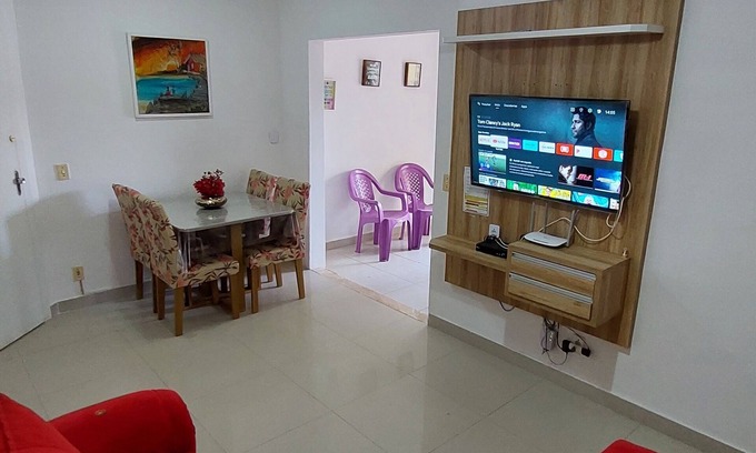 Apartment located in Praia dos Millionarios in Ilhéus-BA, in a gated ground floor condominium, offers air-conditioned accommodation, living room, equipped kitchen, private bathrooms, Smart TV with access to Netflix, one bedroom TV, free WiFi and garden with shower and access to gardens.