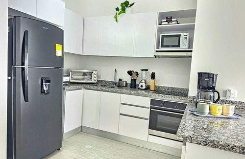 It is a benefit for our guests. Our apartment is comfortable, fresh and is located in the Sierra Beach Resort Condominium in the Pozos Colorados sector (Santa Marta - Magdalena). It is a place where you will experience a feeling of home, it will provide you with tranquility and comfort. Feeling like in your own home you will find: Smart TV in the living room and master bedroom, 2 bedrooms of which 1 has a private bathroom, comfortable sheets, 1 full social bathroom, living room and dining room, fully equipped kitchen, refrigerator, balcony, washing machine, parking, among other facilities. Additionally, you can enjoy the social areas: 2 social pools, jacuzzis, BBQ area, gym, sauna, pedestrian path to the beach and restaurants. AMENITIES: Fully equipped private kitchen Contactless check-in Coffee maker Coffee Oven Refrigerator Dining and living area Smart TV Personal hygiene products Co-Work table Hammock The location of the Condominium is very central, close to the airport, restaurants and chain stores for shopping. Whether you are traveling for business or pleasure, our apartment is a must-see destination.