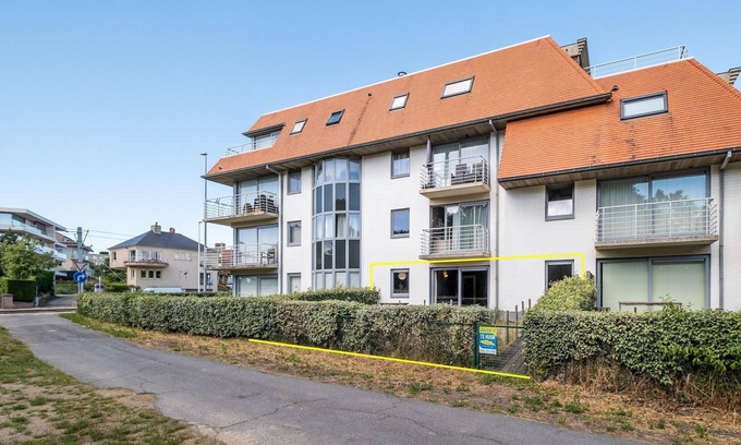 Sunny 2-room ground floor apartment at 250m from the sea and 200m from the center of St-Idesbald (district between Koksijde and De Panne). Pets allowed on request. Garage included in the price. Entrance hall, bathroom with walk-in shower and washing machine, toilet, bedroom with double bed, living room with sitting area, dining area and breakfast corner, open kitchen, storage room, bedroom with 2 single beds, terrace. The apartment is equipped for the disabled: raised hanging toilet with handles, walk-in shower with anti-slip floor instead of bath, 1 bedroom with raised bed to sitting height with handle.