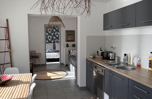 This apartment (40 m2) is independent of the main house on one level with a large terrace with sofa, table and plancha ... It comprises a bedroom (bed 160), a living room with a comfortable sofa bed, a fully-equipped kitchen, a bathroom with shower and separate toilet. You have access to the shared swimming pool. It's the ideal place to discover the Basque country, go hiking or do other activities, or simply relax...or telecommute. Evenings on request