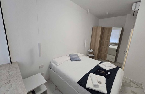 This 50 sq m apartment features two separate bedrooms, one double with a double wardrobe, and a living room with an open-plan kitchen equipped with a dishwasher, fridge/freezer, induction stovetop, Nespresso coffee machine, and basic amenities. The private bathroom includes a shower, bed linens and towels, soap, hairdryer, and shower gel. White marble floors, air conditioning and heat pumps, and a keypad lock are provided. Free Wi-Fi is available. The accommodation facility has 3 parking spaces available for 4 apartments. The parking space for a single reservation must be requested by the customer and confirmed by the accommodation facility.