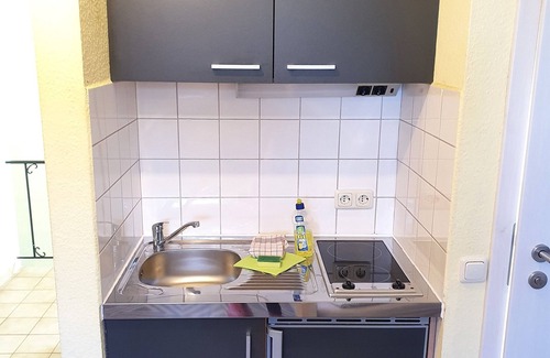 The 20 square meter apartment is located upstairs and offers a kitchenette (2-plate stove, refrigerator, coffee maker, kettle, toaster), a dining area and a comfortable sitting area and a large double bed (180x200cm). The separate bathroom has a shower, toilet, sink and a window. In the hallway you will find a small relaxation area with sofa.