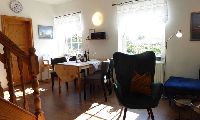 The 3-room non-smoking holiday apartment on the 1st floor in Cuxhaven with its own entrance offers 65 m² of space for up to 4 guests. You will find two bedrooms: one with a double bed (on the 2nd floor) and one with two single beds. The living room is equipped with a fully fitted kitchenette (2.70 m long) including dishwasher, electric stove with ceramic hob and oven, microwave, fridge-freezer, coffee machine, toaster and kettle. In the living area, there is a dining table with four comfortable chairs, a sofa, a table, two armchairs, a bookshelf with books and a safe. The bathroom with window features a shower, toilet, shelf, hair dryer and cosmetic mirror. Wi-Fi and a TV with various TV and music channels are available. For children, there are a travel cot, high chair, handcart, night light, CDs, changing mat, child toilet seat, stair gate, games and books.