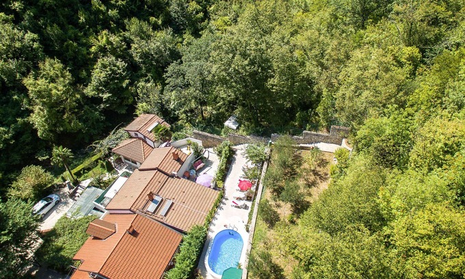 Terraced house "Oscha". 3 km from the centre of Lovran, on the outskirts, 800 m from the centre of Medveja, 5 km from the centre of Opatija, in a secluded position, 800 m from the sea, 800 m from the beach. For shared use: property 1'000 m2 (fenced) with lawn and plants, swimming pool (6 x 3 m, depth 150 cm, seasonal availability: 01.May. - 02.Oct.). Outdoor shower, barbecue. In the house: internet access. Motor access to the house (100 m via unmade road). Parking at the house on the premises. Supermarket 800 m, bus stop 950 m, pebble beach 800 m. Marina 5 km. The owner does not accept any youth groups. Please note: the owner lives on the same property. Airfield 50 km from the property. Access to the rental by car via Camp Medveja.