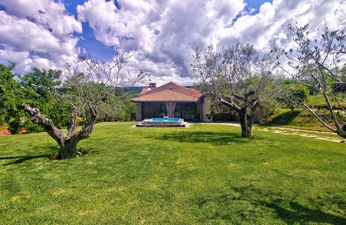 "Rihter", 4-room apartment 140 m2, on the upper ground floor. Comfortable and rustic furnishings: upper floor: living/sleeping room with 1 double sofabed, open-hearth fireplace and satellite TV (flat screen). Exit to the garden, to the terrace, to the swimming pool. 1 room with 1 bed (90 cm, length 190 cm), 1 double bed (1 x 180 cm, length 200 cm). 1 room with 1 double bed (1 x 160 cm, length 190 cm). 1 room with 1 double bed (1 x 140 cm, length 190 cm). Kitchen-/living room (oven, dishwasher, 4 ceramic glass hob hotplates, microwave, freezer) with dining table. Bath/WC, sep. WC. Balcony 15 m2, terrace 25 m2. Terrace furniture. View of the countryside. Facilities: washing machine. Internet (WiFi). 1 small pet/ dog allowed.
