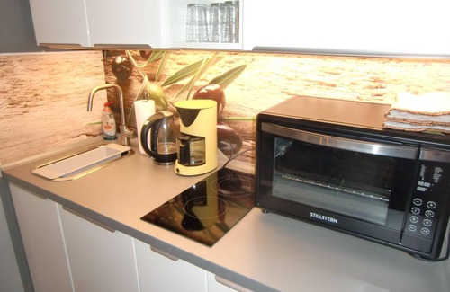 In the comfortably furnished living room there is a corner sofa where you can relax in front of the TV, a dining table and a very well-equipped kitchenette that offers everything you need for meals together.