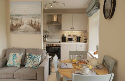 You enter the apartment from the courtyard with a small step up into the hallway, the apartment benefits from being on the ground floor and all on one level. The spacious hallway with plenty of hanging space for coats and a rack for shoes and wellies leads through to the open plan living area and kitchen. Two 2-seater sofas provide ample seating for 4, where you are able to enjoy the glowing electric fire and read a book or while the evening away in front of the smart tv. 2 large windows provide lovely views across the garden and quite often you can watch the pheasants and rabbits saunter past!