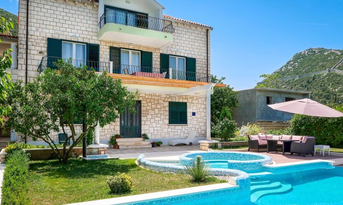 Apartment house "Siga". 300 m from the centre of Mali Ston, on the outskirts, 2 km from the centre of Ston, 80 m from the sea, 80 m from the beach, located by a road. For shared use: property 1'500 m2, lawn, swimming pool (50 m2, depth 130 - 180 cm, seasonal availability: 04.Apr. - 06.Nov.) with internal staircase. Terrace, barbecue house. In the house: internet access. Parking on the premises. Shop 2 km, bus stop 1.2 km, rocky beach 80 m. Swimming pool with counterflow and hydromassage.