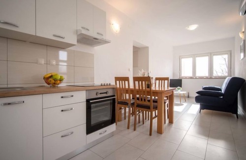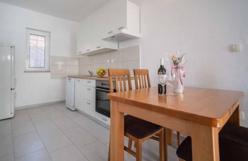 "Suzana", 3-room apartment 56 m2 on 1st floor, south facing position. Living/dining room 20 m2 with satellite TV (flat screen), air conditioning. Exit to the terrace. 1 room with 1 double bed (2 x 80 cm, length 200 cm). 1 room with 1 double bed (2 x 80 cm, length 200 cm). Exit to the balcony. Open kitchen (oven, dishwasher, 4 ceramic glass hob hotplates, freezer). Shower/WC. Air-conditioning (extra). No heating option. Balcony 5 m2, terrace. Terrace furniture. Beautiful view of the sea. Facilities: Internet (WiFi, free). Please note: non-smokers only.
