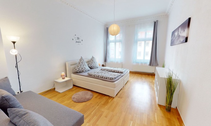 The holiday apartment traumhafte Jugendstilwohnung Gohlis is located in Leipzig and is perfect for an unforgettable holiday with your loved ones. The 120 m² property consists of a living room with a sofa bed for 2 people, a kitchen, 3 bedrooms and 1 bathroom and can therefore accommodate 12 people. Additional amenities include Wi-Fi as well as a TV. A baby cot is also available.