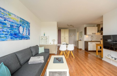 Address 24159 Kiel, Fliegender Holländer 39 App 237Family vacation, or time for two: This apartment is suitable for everyone who is looking for relaxation. Description In the 3rd Floor (no elevator) in the terraced Olympic center is this holiday apartment with 1.5 rooms. On 46sqm it offers space for up to four people. The light-flooded living and dining area is bright and modern. In addition to a table and chairs, there is also a cozy couch in the laminate area. The sofa can be converted into a comfortable sofa bed (lying area of 160x200 cm) in just a few steps and offers space for up to 2 people. If necessary, the apartment can of course be darkened with curtains. In addition to a 40-inch flat-screen TV with DVD player and a stereo, you have free WiFi available. A wardrobe provides enough storage space. In the separate bedroom - without a door to the living area - there is a large double bed (lying area of 180x200 cm). A ceiling fan ensures cooler temperatures there in midsummer. The tasteful kitchen is fully equipped and has everything you need for cooking: There is a large refrigerator with a separate freezer compartment, as well as a dishwasher and a ceramic hob with an oven. Glasses and porcelain are available for 6 people. The well-kept shower room has a spacious shower area (walk-in shower). The floor-to-ceiling window front of the combined living and dining area lets you look out onto the 9sqm balcony. It is equipped with high-back chairs, a table and an awning. The unobstructed view of the salt marshes is calm and you can enjoy the sun to the fullest all day (south-west facing).[nbsp] Special featuresYou can park your car on the parking space included in the rental price, for this there is a parking space key in the apartment. We are happy to offer you an underground parking space for a fee directly in the system. Bicycles can be accommodated in a closed outdoor area. 2 towels per person (no beach towel) and bed linen and tea towels are included and can be found in the apartment on arrival. This apartment is a non-smoking apartment. You are welcome to smoke on the balcony - thank you for your understanding. The apartment is also suitable for allergy sufferers, as animals are not allowed.