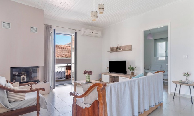 Offering beautiful views of the Ionian Sea, the Vrettos Home apartment is located in Spartochori. The 80 sq.m. property consists of a living room, a well-equipped kitchen, 2 bedrooms and 1 bathroom, and can accommodate up to 5 people. Additional amenities include Wi-Fi, television, air conditioning and a washing machine. The rental property features a private wrap-around balcony, ideal for evening relaxation.