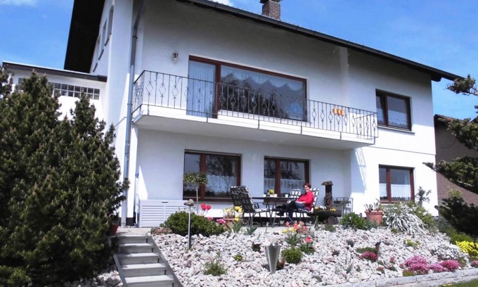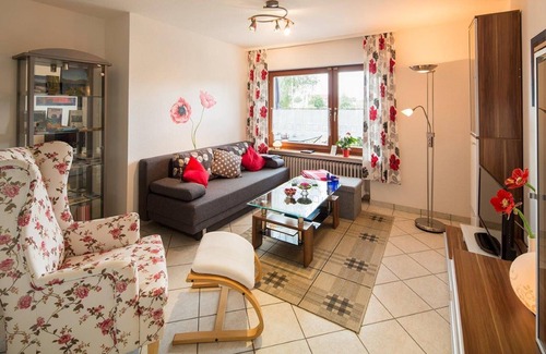 Separate entrance, terrace, Wi-Fi, My Edersee Card +, biking and hiking friendly. arrive, feel good, enjoy ... Enjoy the quiet south and west location, the view of meadows and fields, directly on the jungle and Kellerwaldsteig. Our new apartment for 2 to 4 people, is barrier-free, has a separate entrance and a partially covered terrace, where you have the sun all day long. There is a parking space and your bicycles can be safely parked. Parasols, loungers and a charcoal grill are available. In the modern designed living room there is an LCD TV with teletext, compact system CD + radio and a couch with spring core to take off (140x200 m). For tired legs, the large cane chair with stool is an ideal rest. Also Wi-Fi is available. The separate kitchen is bright and fully equipped with ceramic hob, extractor fan, coffee maker, kettle, microwave, mini-oven, toaster, thermos, fridge freezer. Outside there is a charcoal grill. The bright and friendly furnished bedroom has a double bed with two single mattresses. The bed has comfort height. The beds are adjustable in height at the top and bottom of the chair A blackout blind is just as present as a washbasin. The bathroom is equipped with a vanity unit, vanity unit, large shower room, stool, hair dryer and make-up mirror. There is a daylight window available. The toilet is separate. Otherwise, in the apartment still, first aid kit, iron and - board, vacuum cleaner and information folder available.