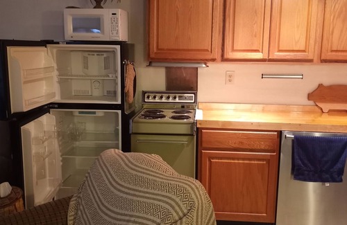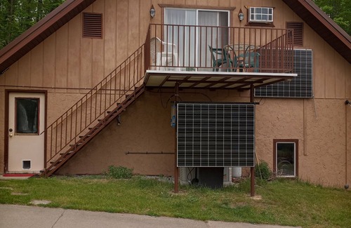 This 1 bedroom upper apt sleeps 5 in 4 beds. A nice size full bath. The open concept LR/DR/complete kitchen is comfortable and has a great view overlooking acres of woods. Step out the door and enjoy your own balcony.