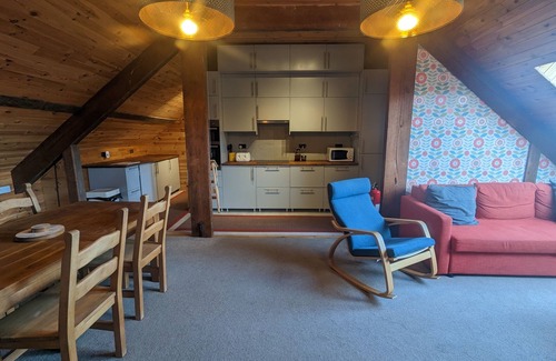 Open plan lounge/kitchen/diner heated by a wood pellet stove that also provides blown air heating to the apartments other rooms.