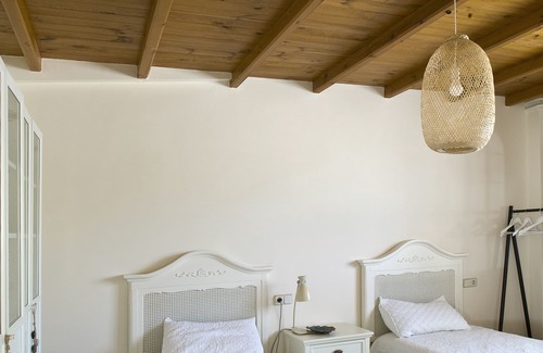 Mas Can Sot III has two double bedrooms, one with a double bed and the other with two single beds. Both are decorated with very good taste, white, brown and blue tones predominate. In addition, the ceiling is made of wood that converts the rooms of this tourist apartment of L’Empordà into very warm and welcoming spaces.