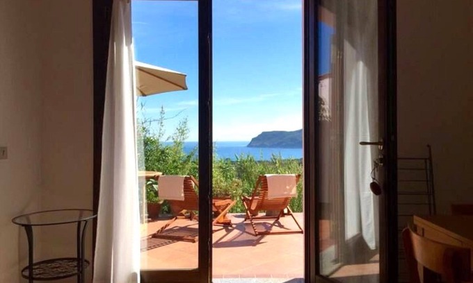 A few minutes' drive from the sandy beach of Lacona, the apartment is located in a hilly position with a wide sea view. The two-room apartment consists of a living room with kitchenette and sofa, double bedroom, bathroom with shower. Extra bed space on the sofa (with weekly supplement). Sea view terrace equipped with table and chairs for outdoor dining. Equipped with wi-fi, not equipped with TV. The terrace has no parapet and therefore families with small children are not accepted. Parking space, small pets allowed with a supplement of €30.00 to be paid in advance.