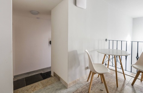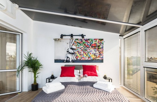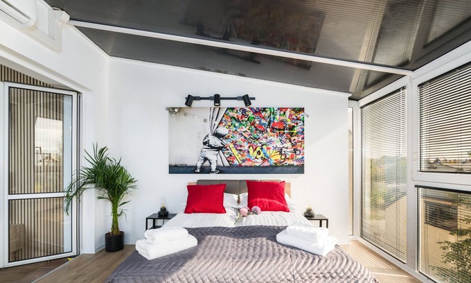 The modernly decorated apartment has the ability to accommodate 2 people. The interior of the apartment consists of a living room, fully equipped kitchenette, bedroom, hallway and bathroom with shower. The living area, equipped with a comfortable sofa and a flat-screen TV, is the perfect place for rest and relaxation. The incredible large windows in the bedroom add great effect and brighten up the space. There is a comfortable double bed, as well as a remote work area. Guests can take advantage of the high-speed free Wifi connection. In addition, the apartment has access to a balcony from the living room and kitchen. A wide range of amenities and comprehensive equipment of the apartment with the necessary accessories and equipment for kitchen and bathroom guarantees a comfortable stay. For a good start to a pleasant stay, we provide guests with complimentary toiletries (soap, shampoo and shower gel), towels and linens. If necessary, a washing machine is available in the utility room on the first floor. The property is distinguished by its careful finishing, tasteful decor, aesthetics and functionality.