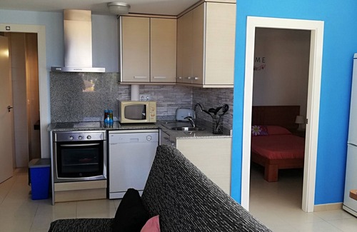 Two rooms one with a double bed and the other with two beds of 90, bathroom with shampoo and gel bathtub, 30-meter L-shaped terrace, free parking space, private street. Community pool open seasonally, apartment 100 meters from the beach and the Papa Luna promenade, shops around, cafeterias restaurants and souvenir shops.