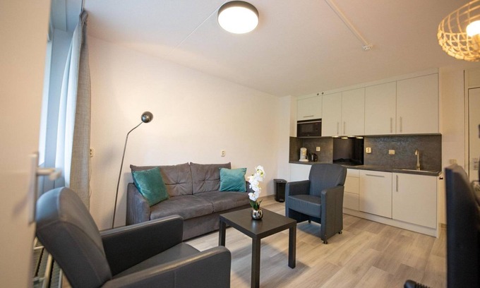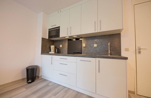 These apartments are suitable for 2 people to a maximum of 4 people and are located on the first and second floor. The living room with open kitchen has a dining table with chairs and a double sofa bed. The open kitchen is equipped with a 4-burner hob, refrigerator, Senseo machine, microwave, dishwasher and kettle. There is one bedroom with two single beds. The bathroom has a shower and sink. The apartments have a balcony with furniture.