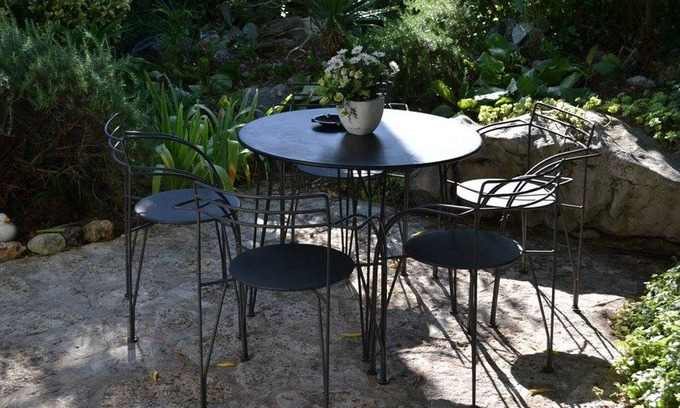 Layout: On the 1st floor: (Living room(TV, dining table, seating area), Kitchenette(stove, electric kettle, coffee machine, microwave, fridge, freezer), bedroom(2x single bed), bedroom(double bed), bathroom(shower)) toilet, guest toilet, balcony, air conditioning, garden, BBQ, parking lot(public)