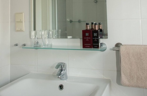This apartment has in the bathroom a wonderful bathtub, a shower, sink and toilet.